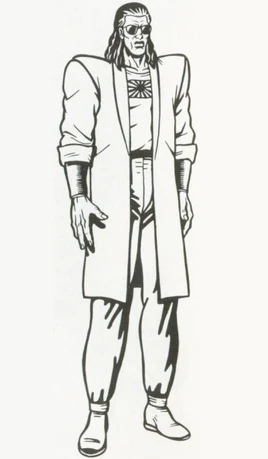 He is clad in a long red jacket with its sleeves wrapped all up his forearms, ready for a brawl. He wears big stylish sunglasses that, in conjunction with his facial features, make him a dead ringer for the Terminator, along with long hair fashioned in a mullet style. His cold expression suggests he is a ruthless killer just doing his job.